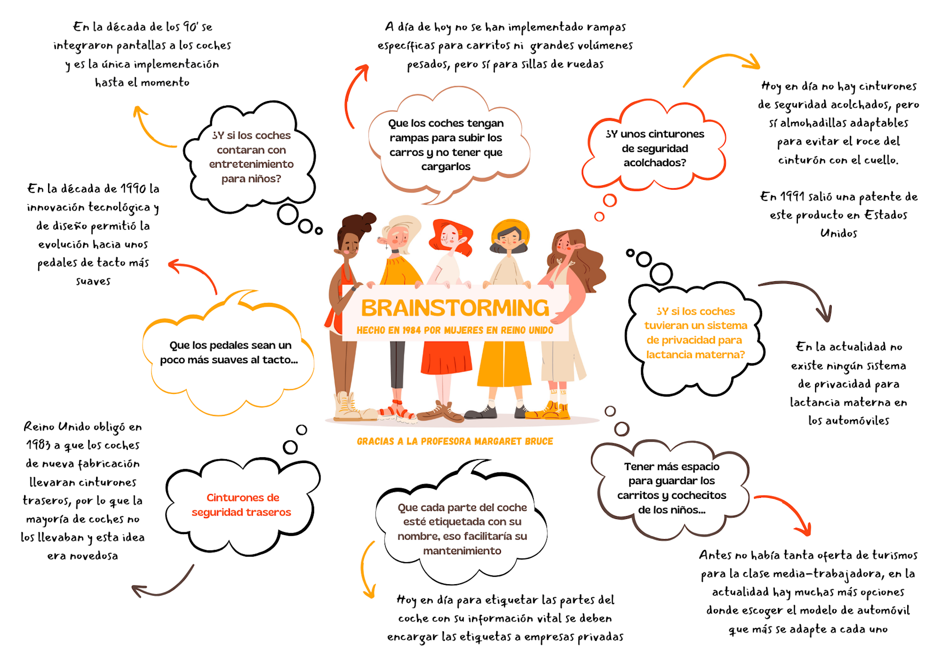 Otra de las ideas que recibió Bruce consistía en poner etiquetas para identificar las piezas del coche y facilitar el mantenimiento. Además, el grupo de mujeres propuso ideas relacionadas con el cuidado de bebés que aún hoy apenas se han explotado.